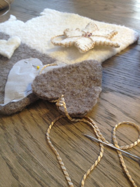 Det strikkes først et stykke i glattstrikk som toves i maskin. Så er det bare å klippe ut former som kantes med knapphullsting. Oppskrift i Dale Garns julehefte 272.