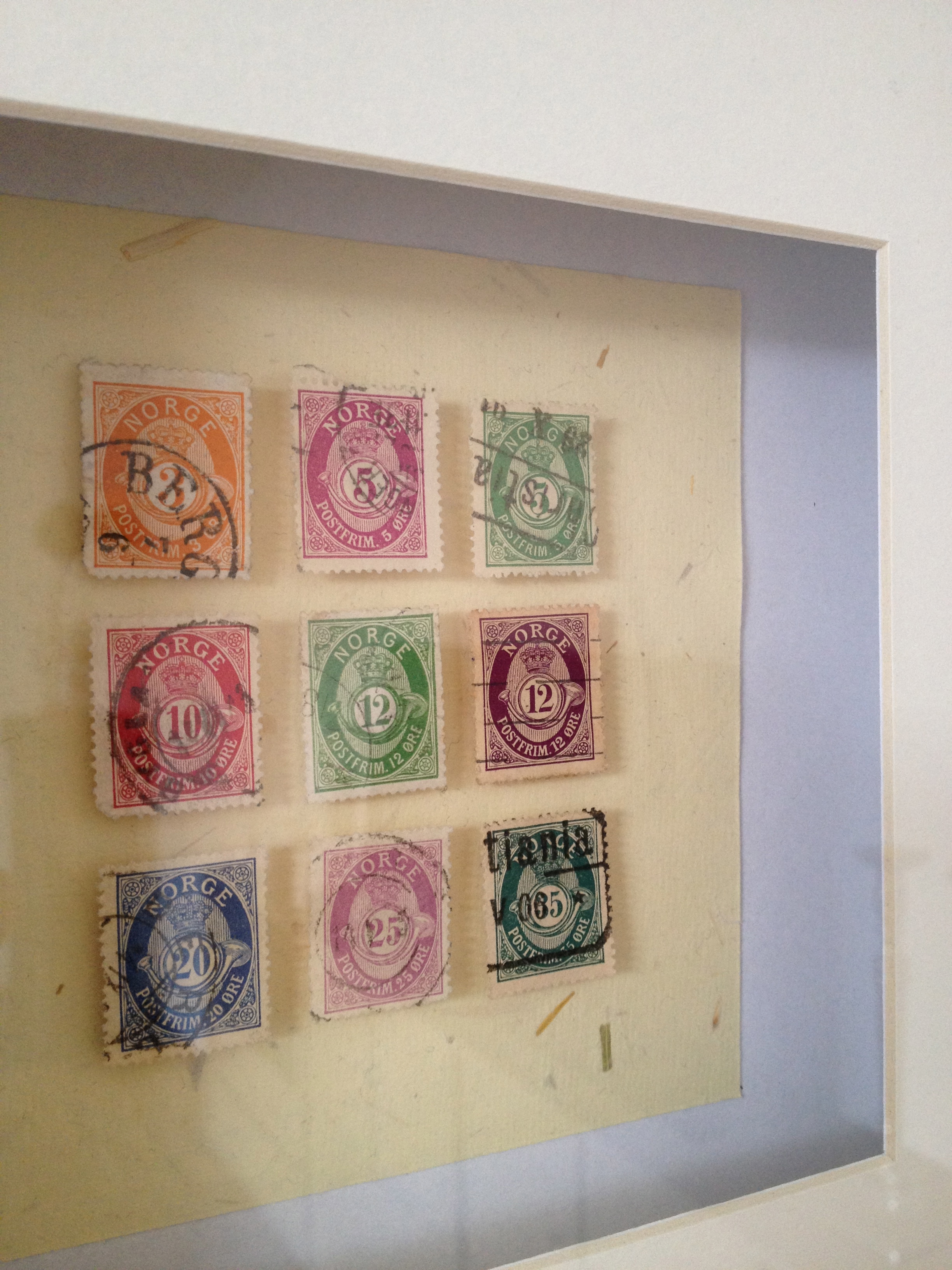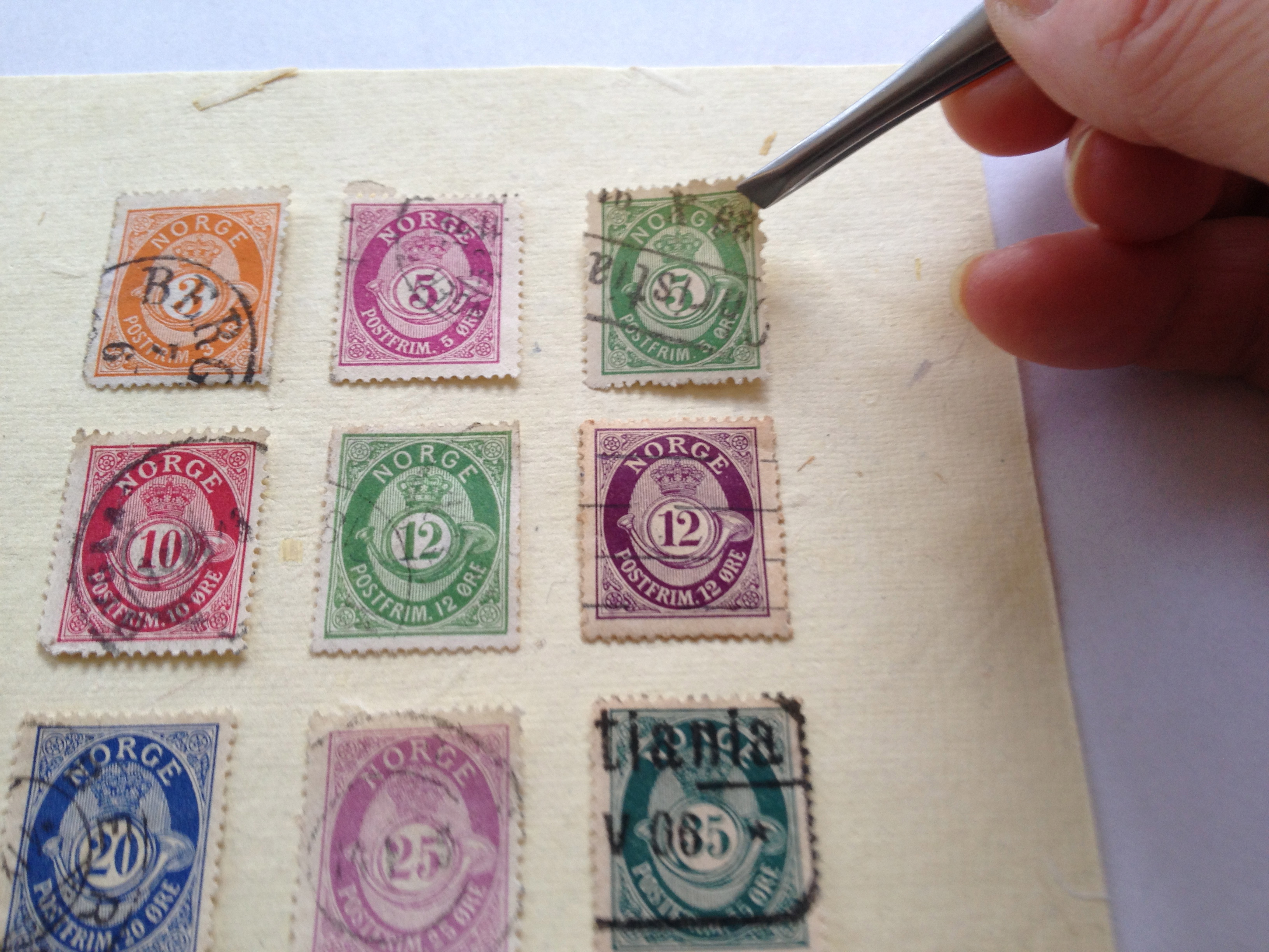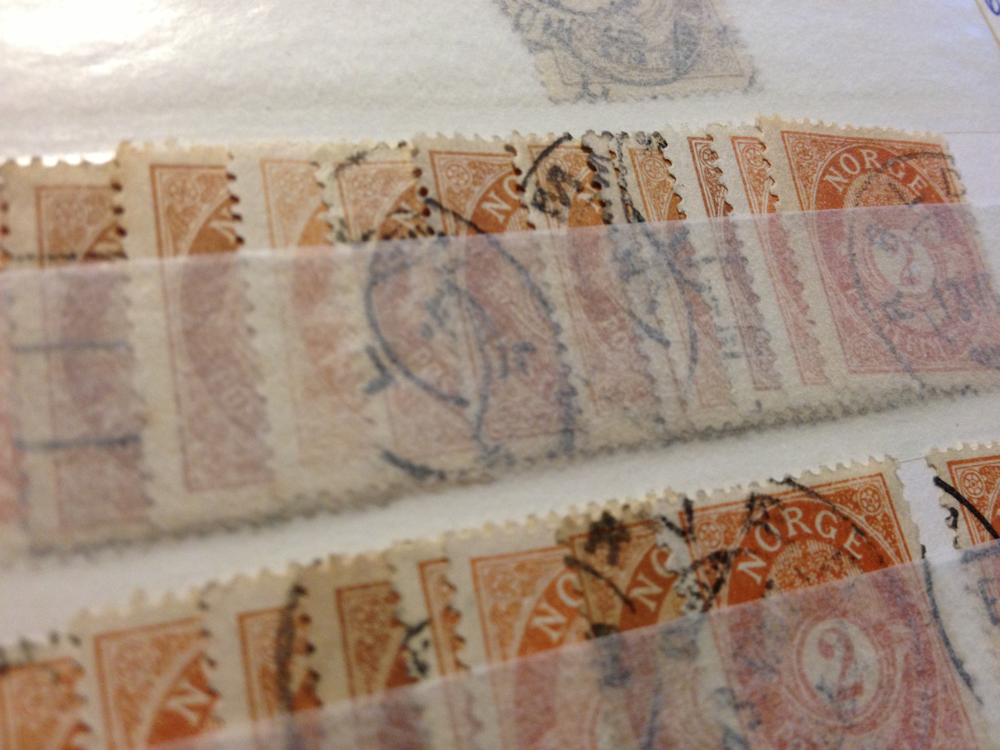 Jeg har vært så heldig å få ‘låne’ frimerkesamlingen til Per. Er redd den ikke er fullstendig når den blir returnert. Det er så mange fine frimerker! Jeg liker best de i en-fargers trykk. Her har jeg laget en sammensetning av de norske posthornmerkene som har vært i bruk i Norge helt siden 1871. Mer om posthornmerkene kan du lese her.