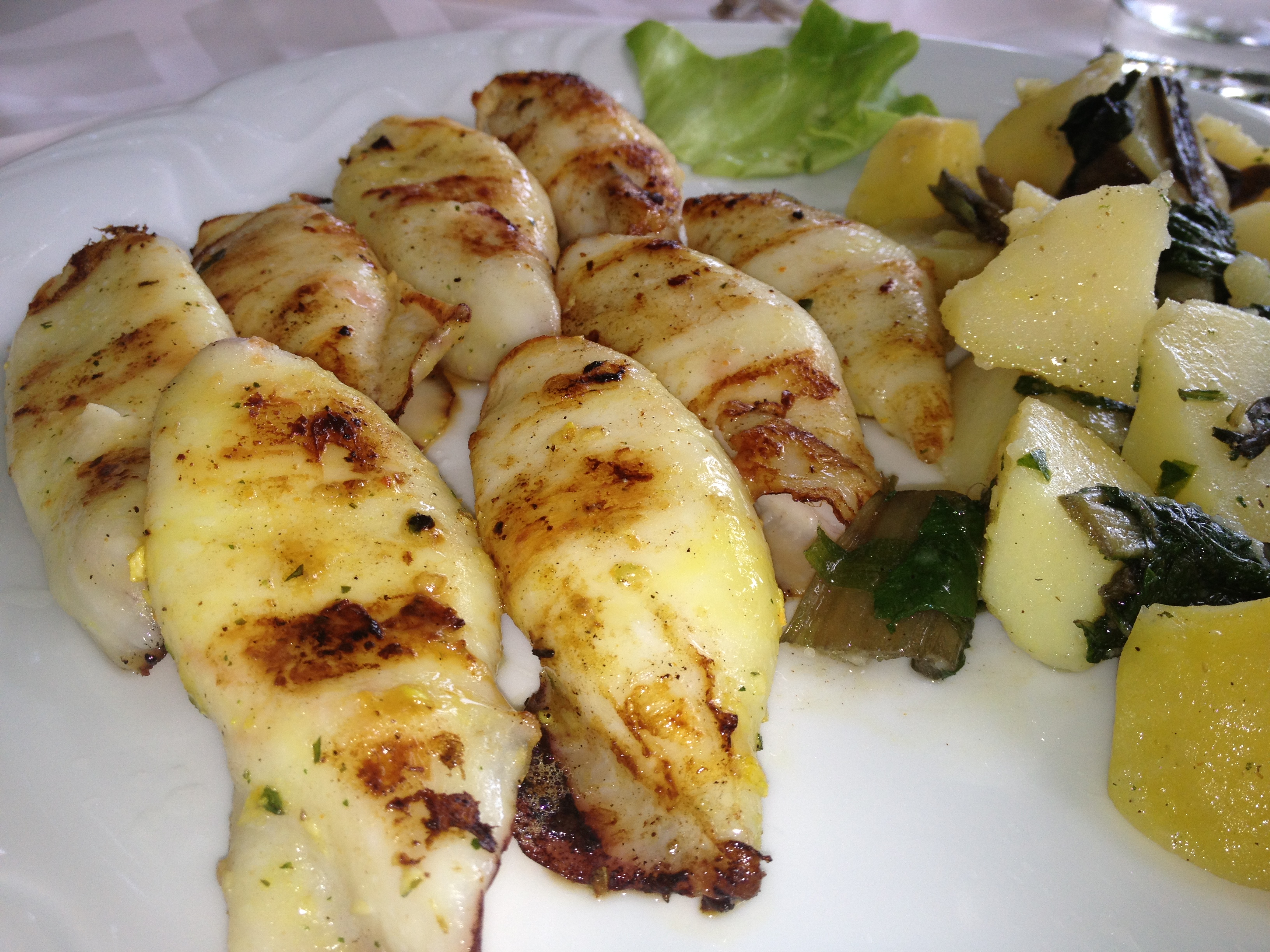 Lunsj under druene på restaurant Drago. God mat og til Oles begeistring glutenfritt brød som smakte veldig godt.