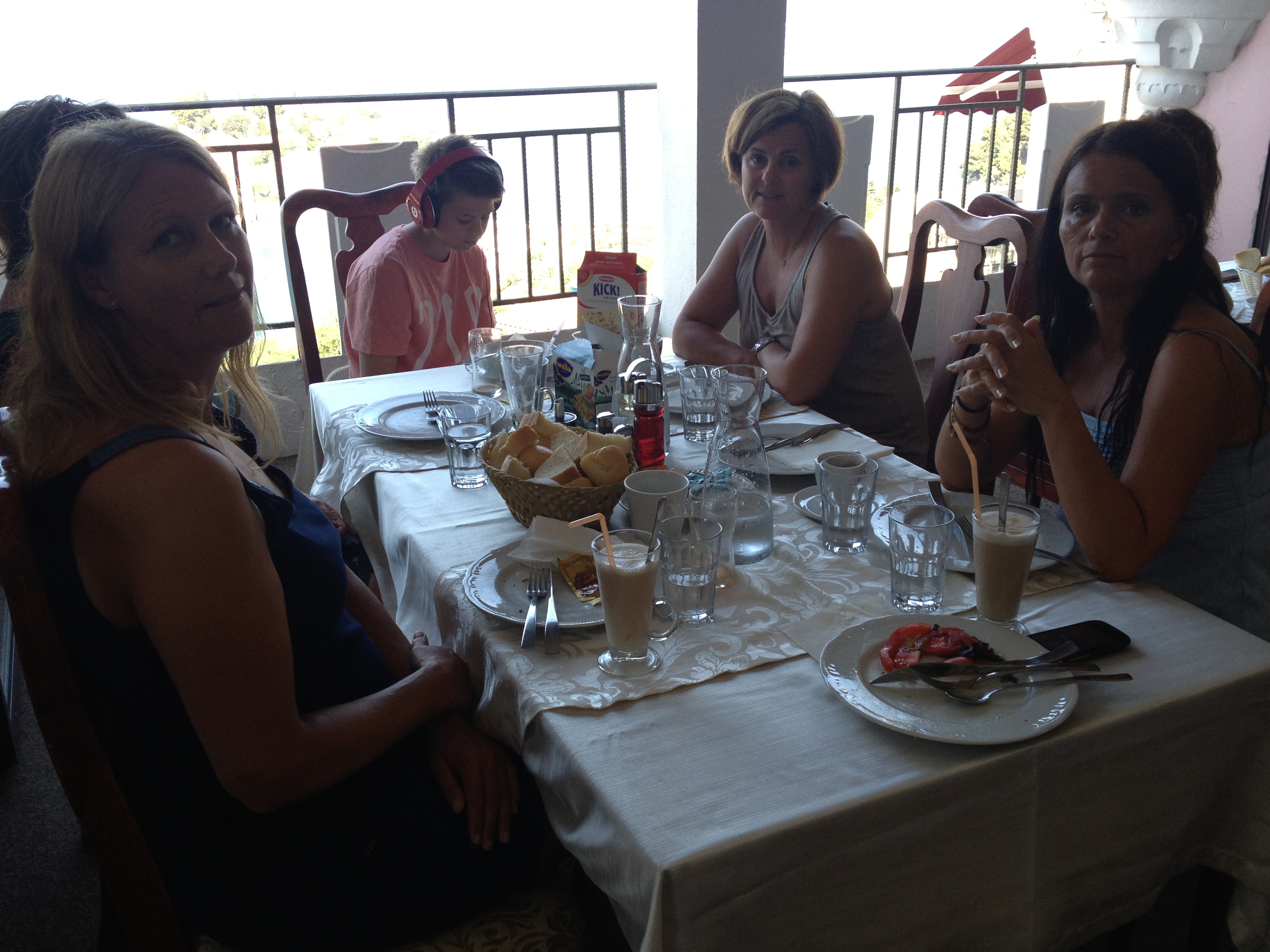 Nå er Siv, Pål og Ole også kommet til Sveti Stefan, her frokost på hotellet.