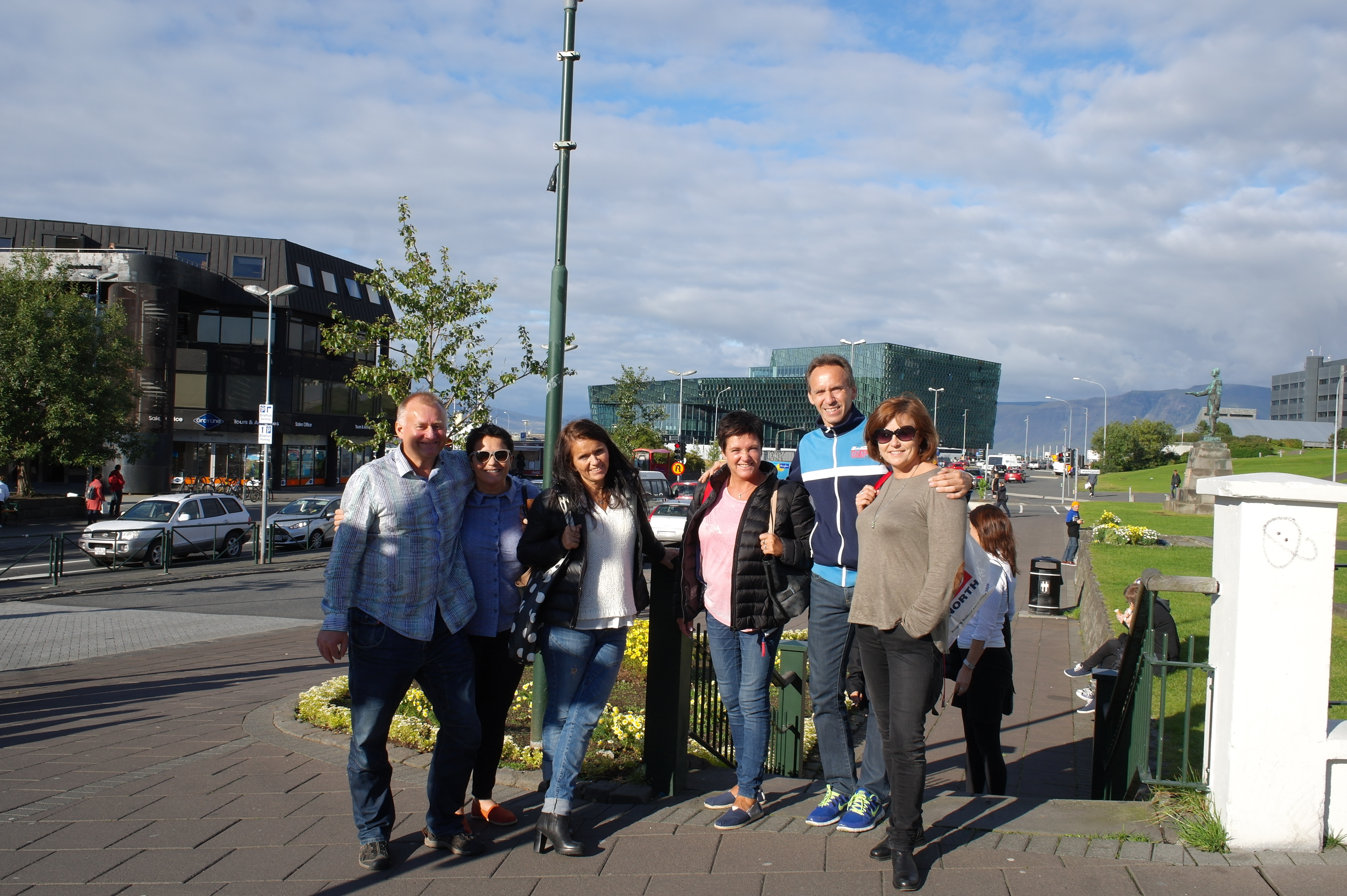 Hele gjengen samlet til gruppebilde utenfor Perlan.