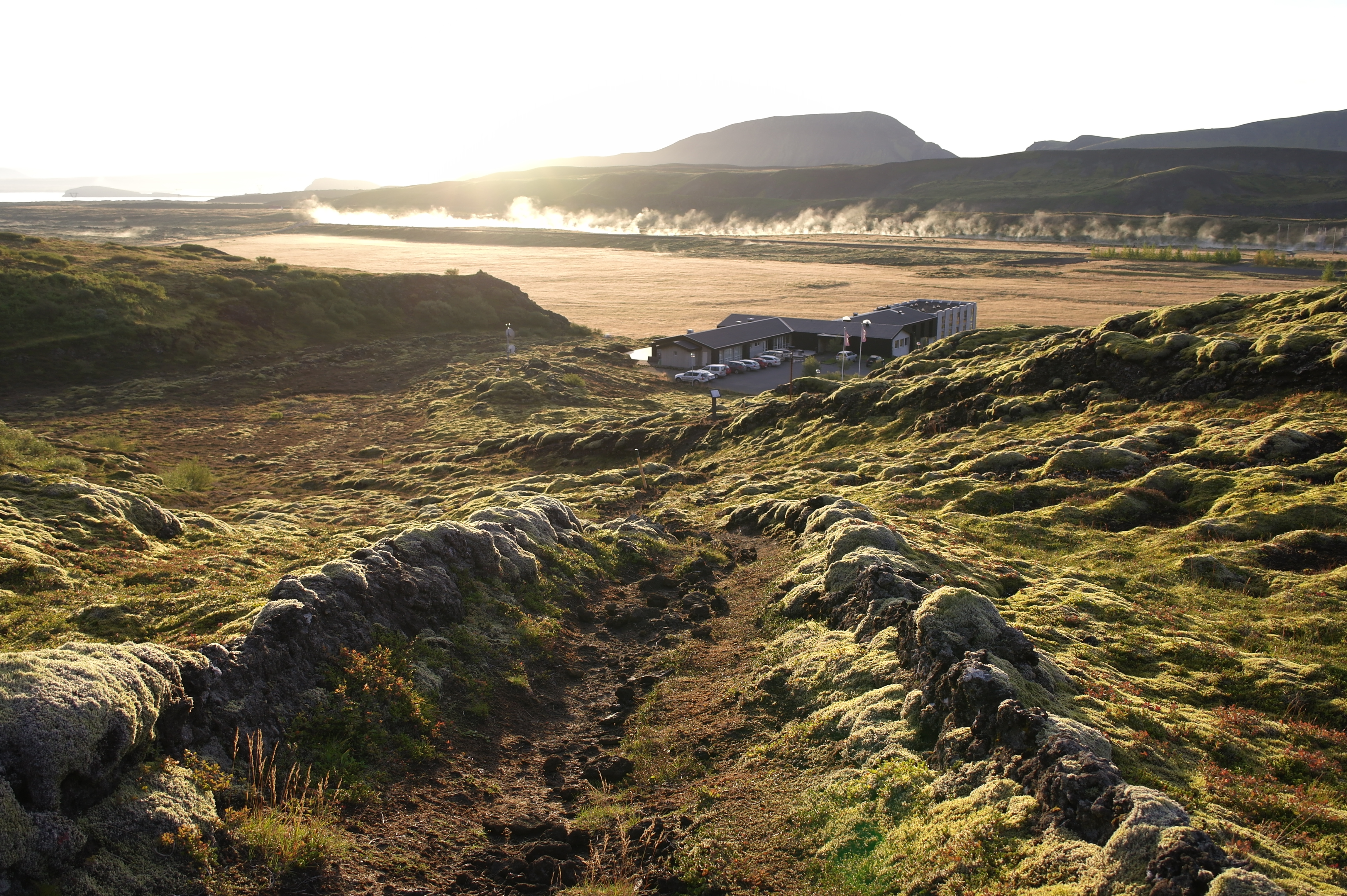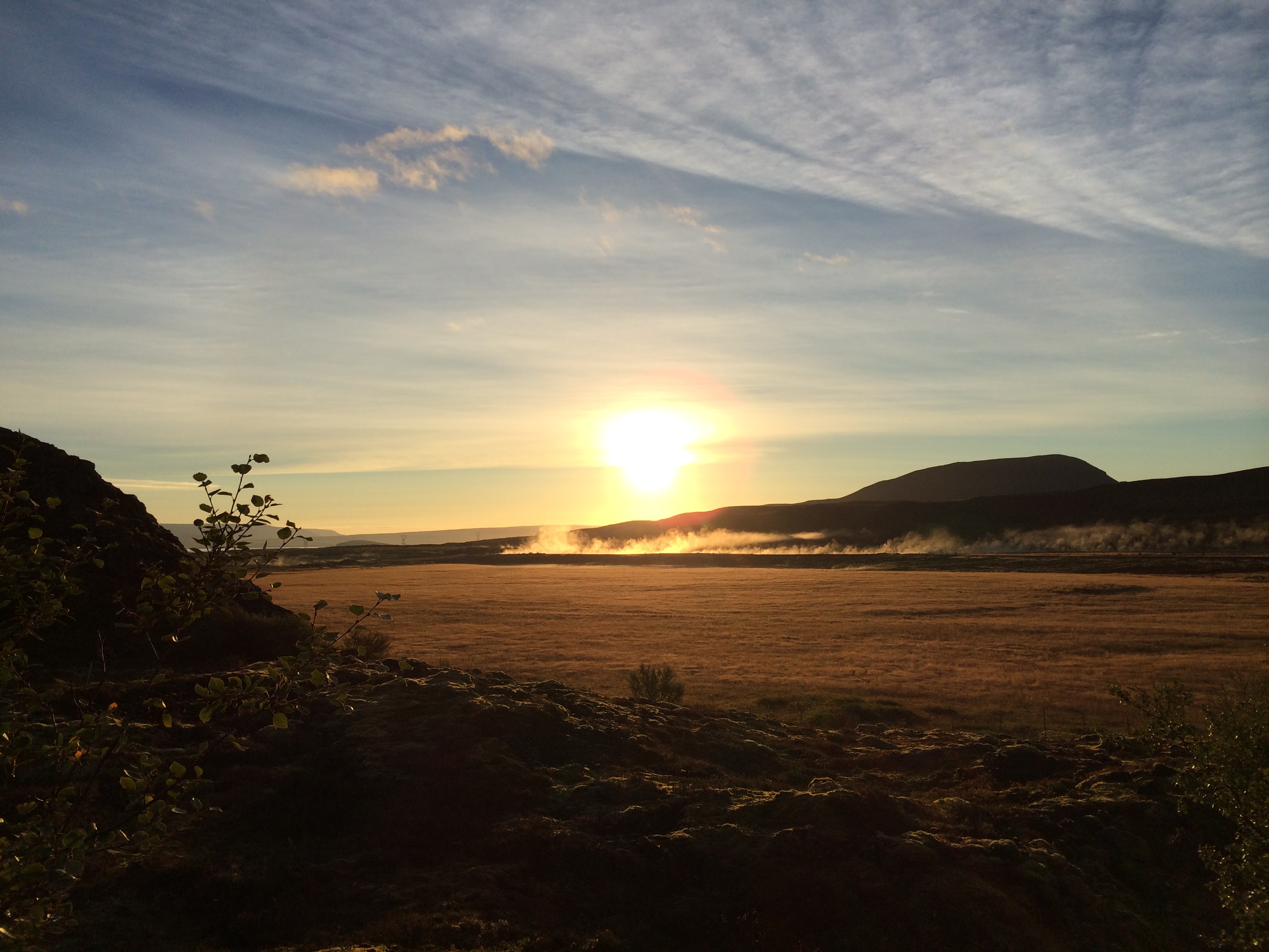 Neste morgen våkner vi til en fantastik soloppgang. Det er ikke frostrøyk på jorden, men en varm bekk som renner der borte.