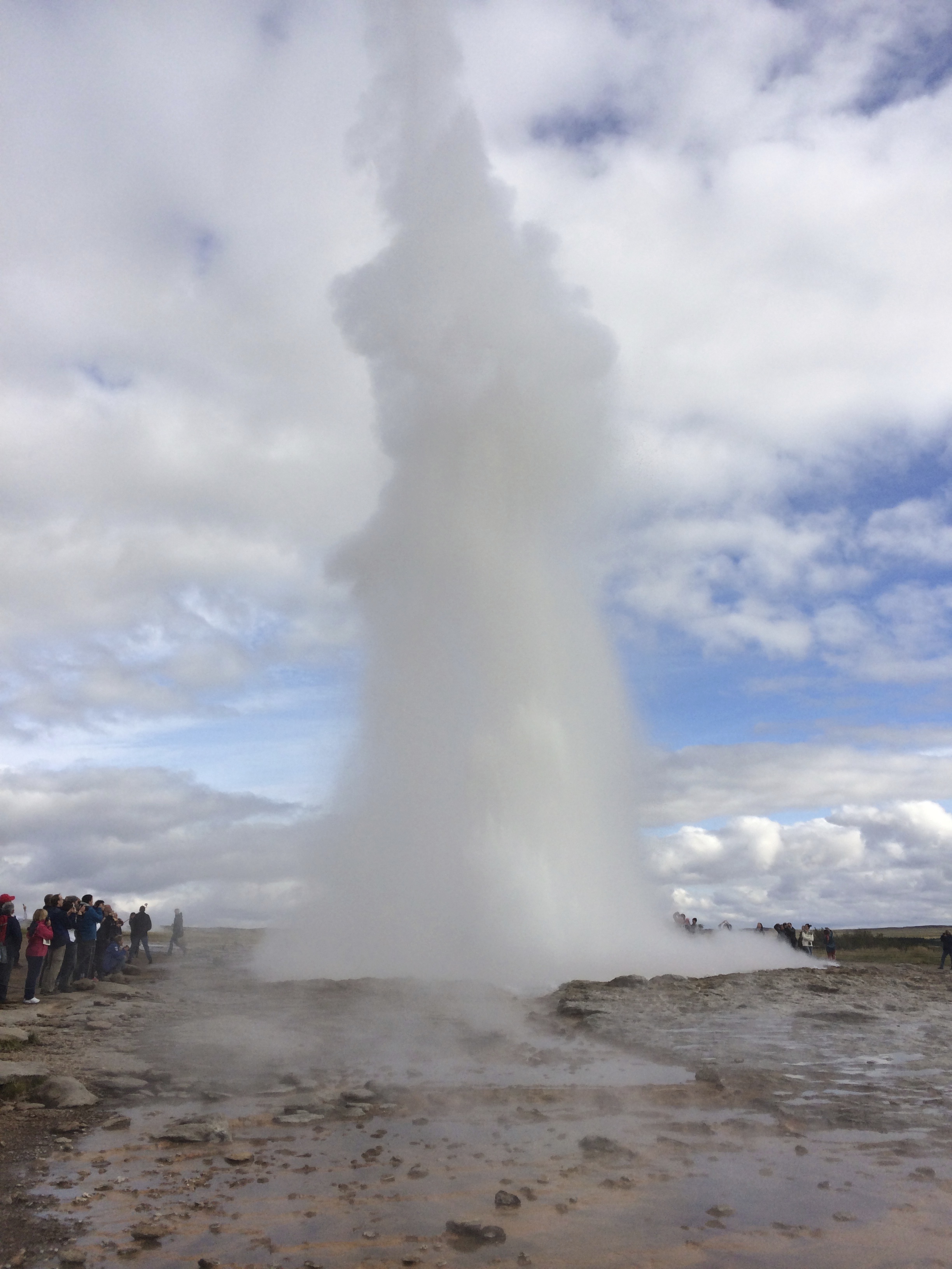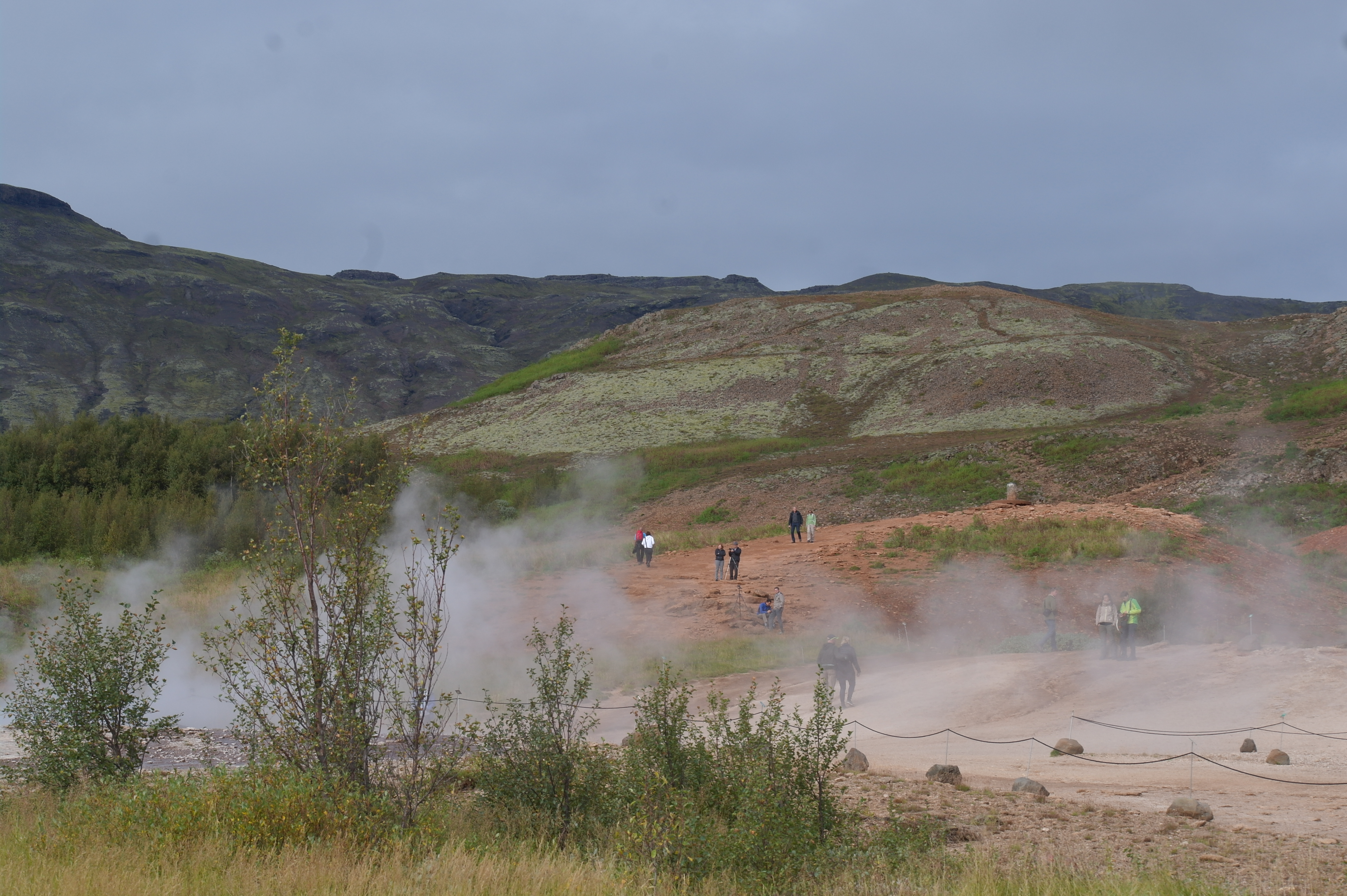 I området Haukadalur hvor det syder og bobler fra varme kilder og geysirer. Her venter vi på ny sprut fra den største geysiren Strokkur.