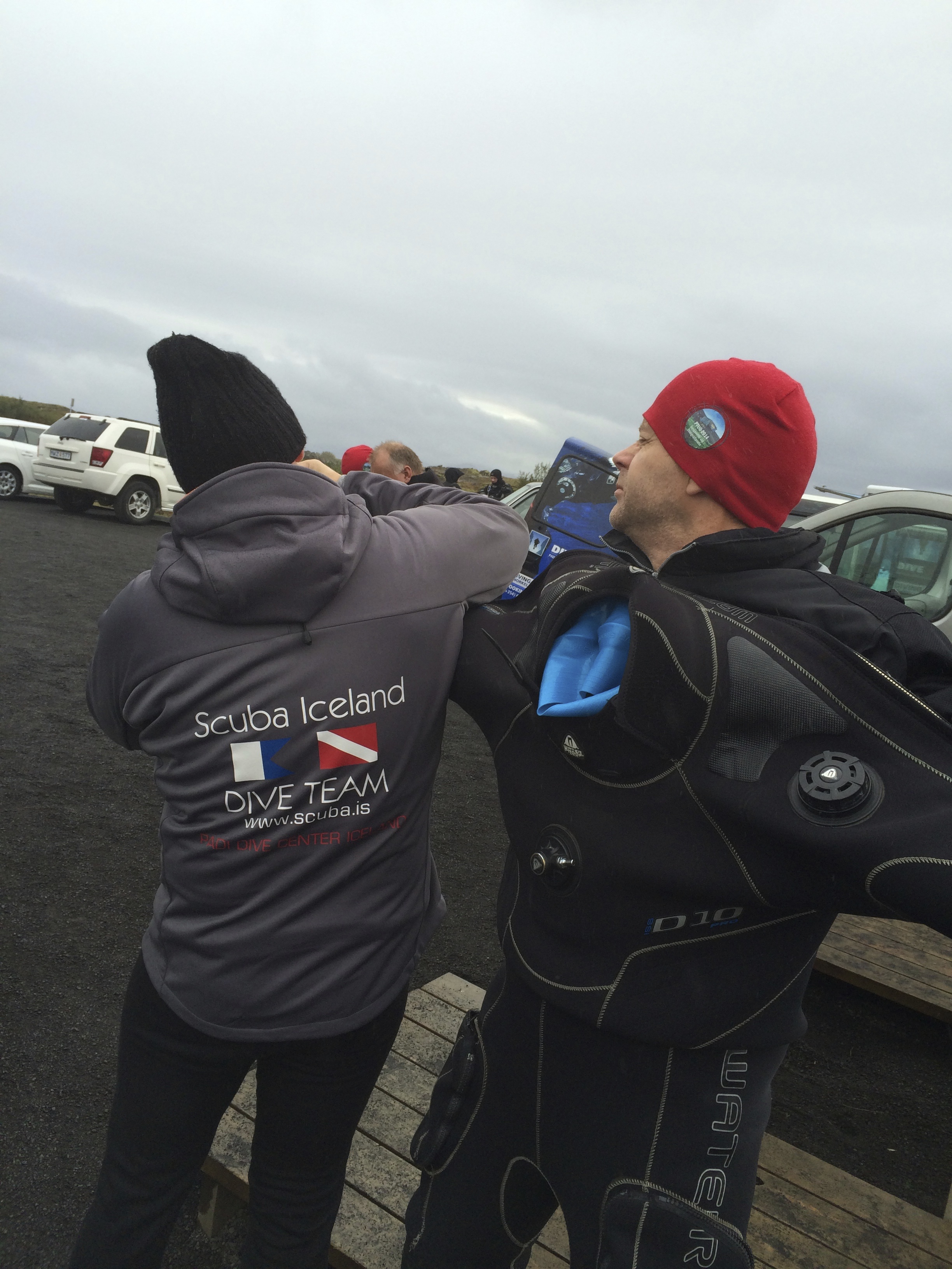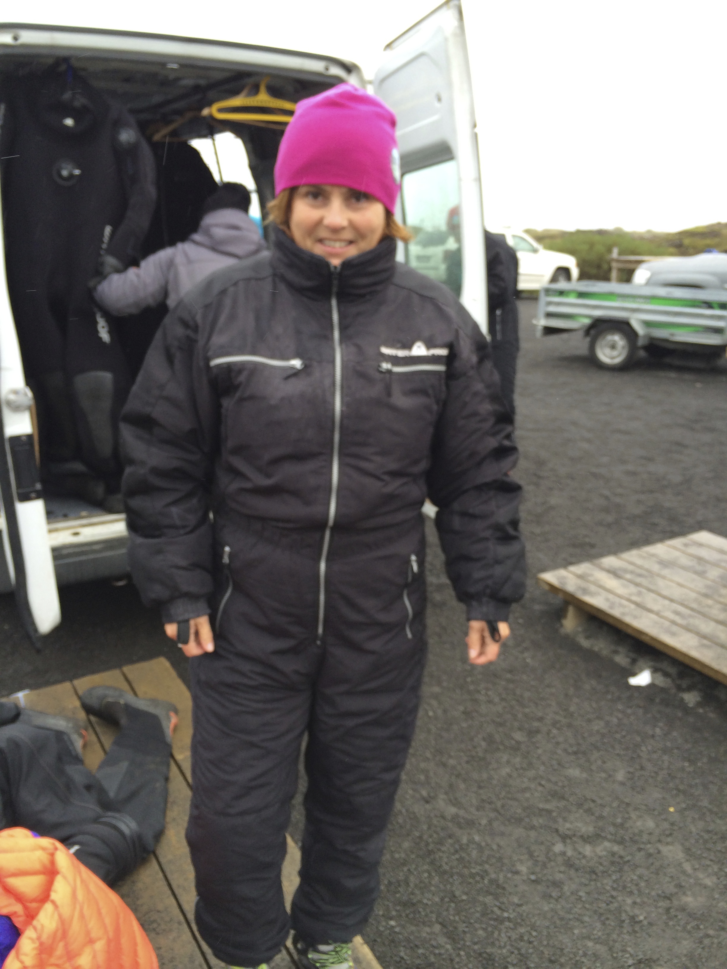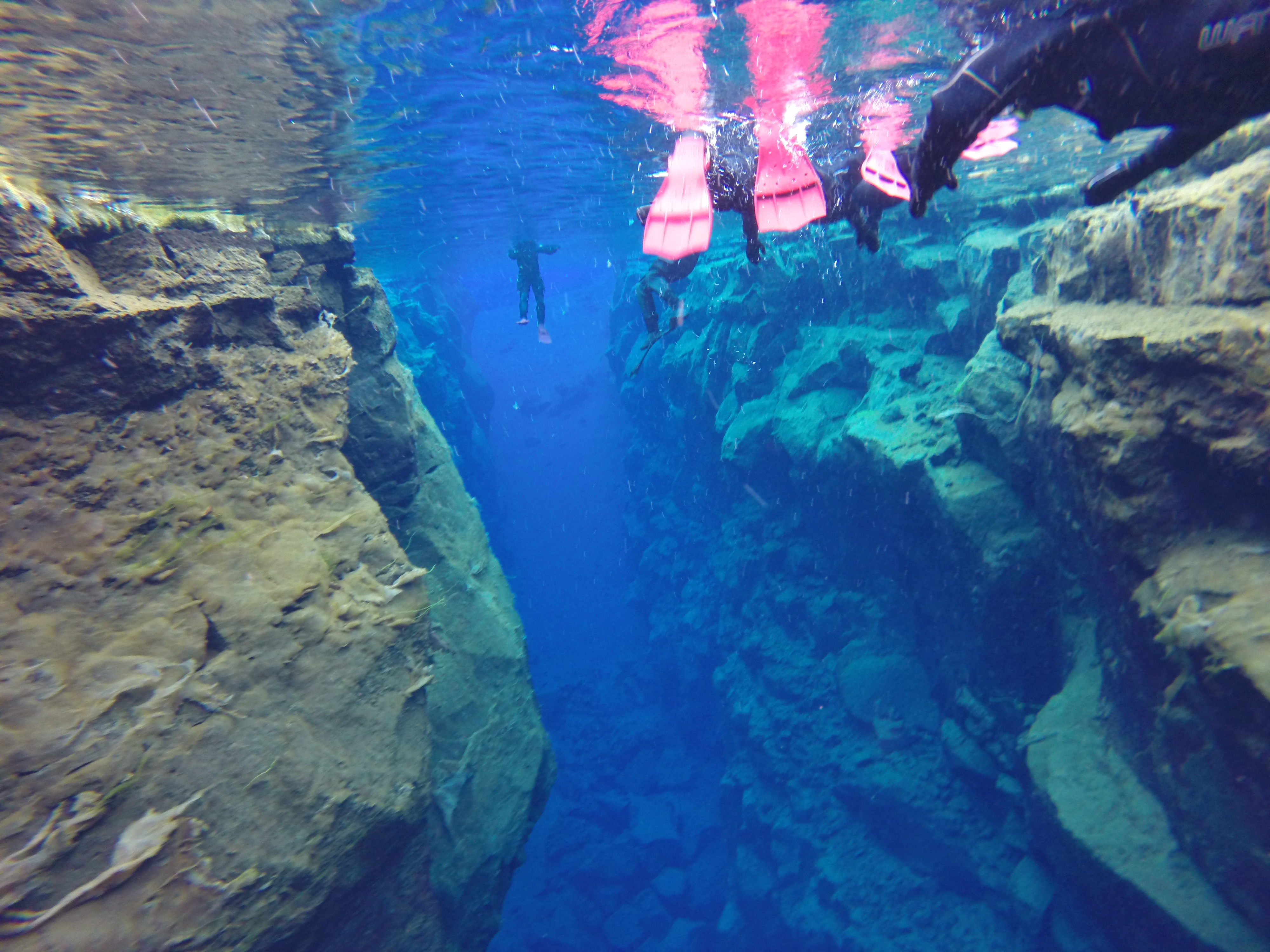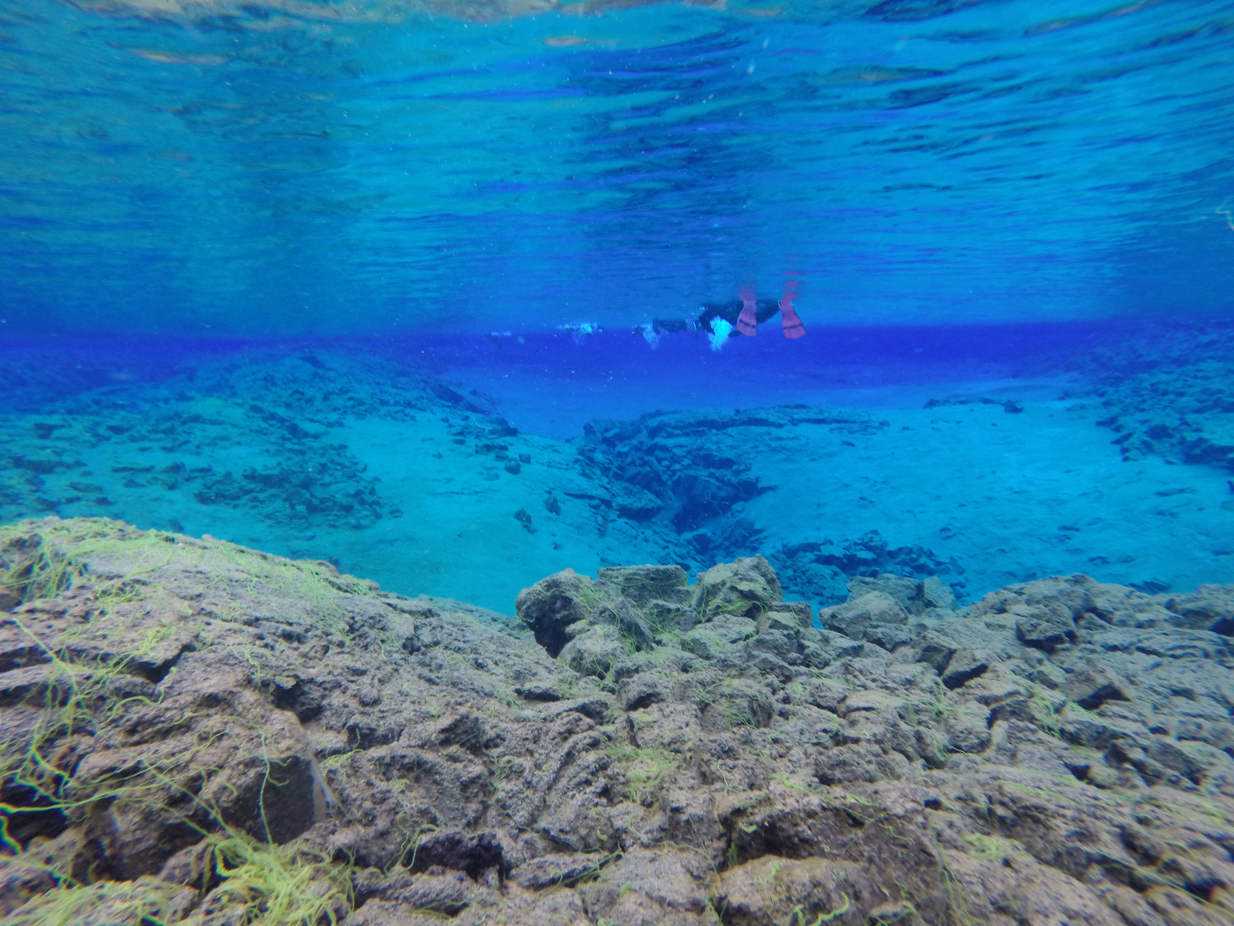 Snorkling i Silfra-kløfta i Thingvellir. Eneste plassen i verden du kan dykke i mellom to kontinenter. Snart klar for bading i 2 grades vann, da er det ganske greit med proff påkledning.
