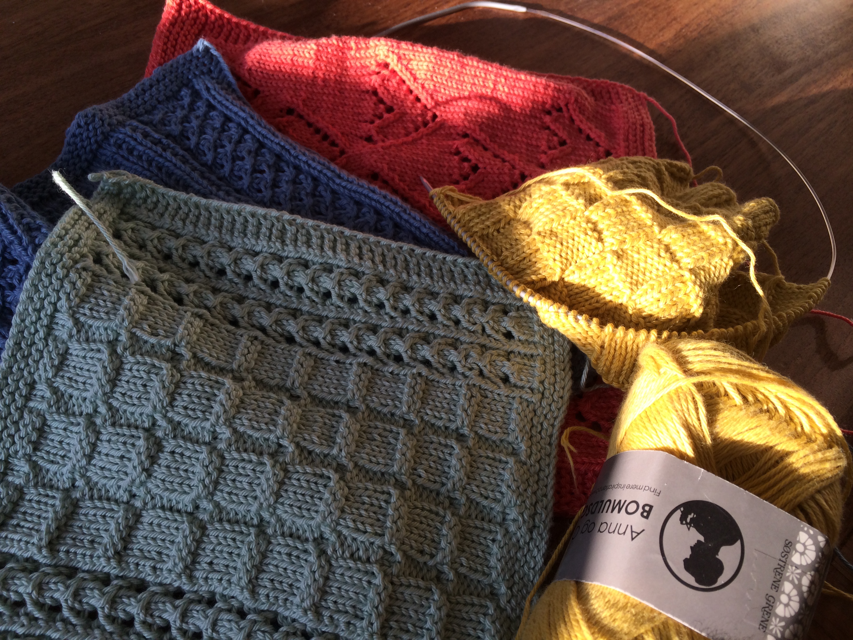 Inspirert av Bittamis Design for strikkelystne har jeg strikket kluter i mange forskjellige mønster. Mønster til disse klutene har jeg lastet ned fra Facebook siden hennes. Garn fra Søstrene Grene og Stoff & Stil.