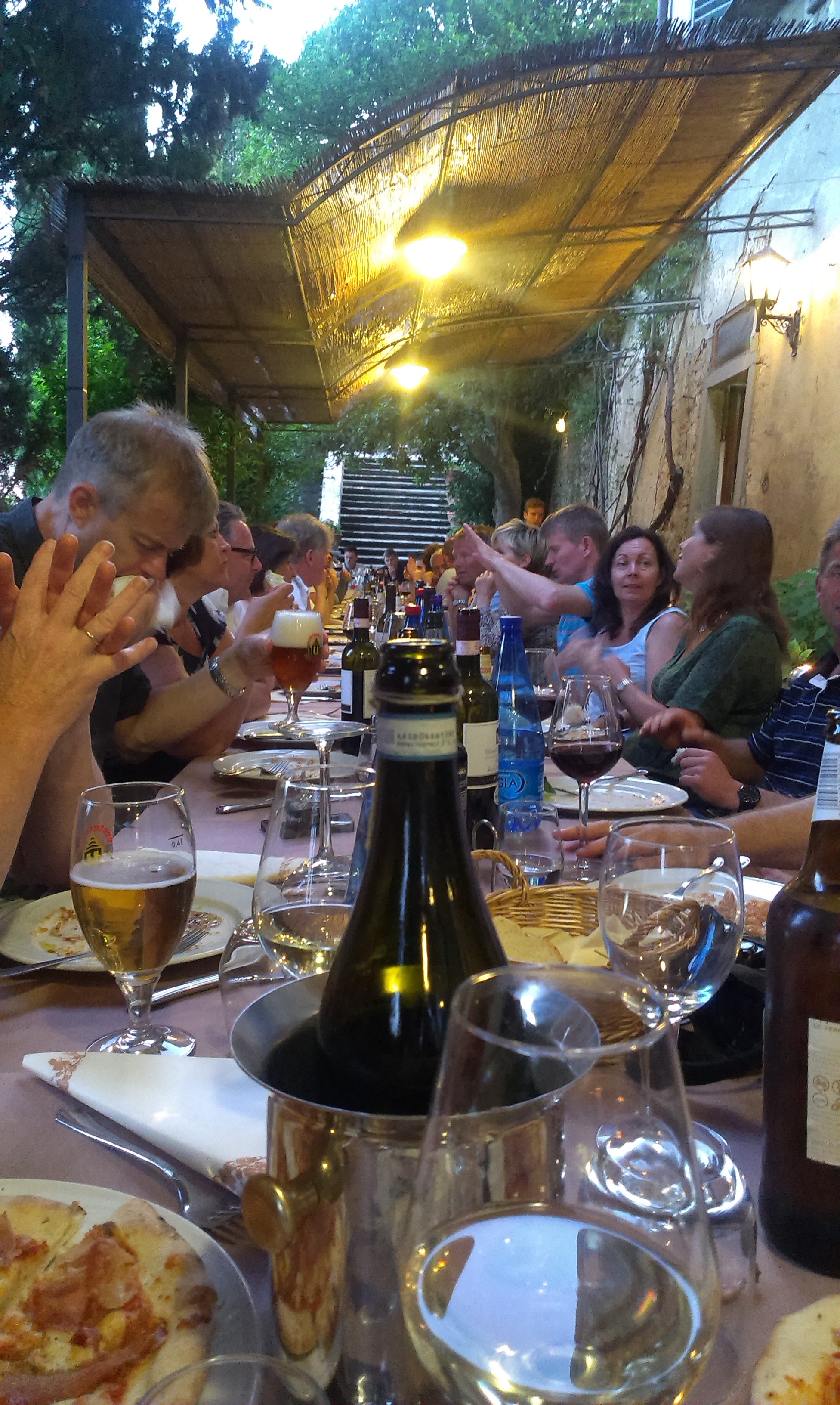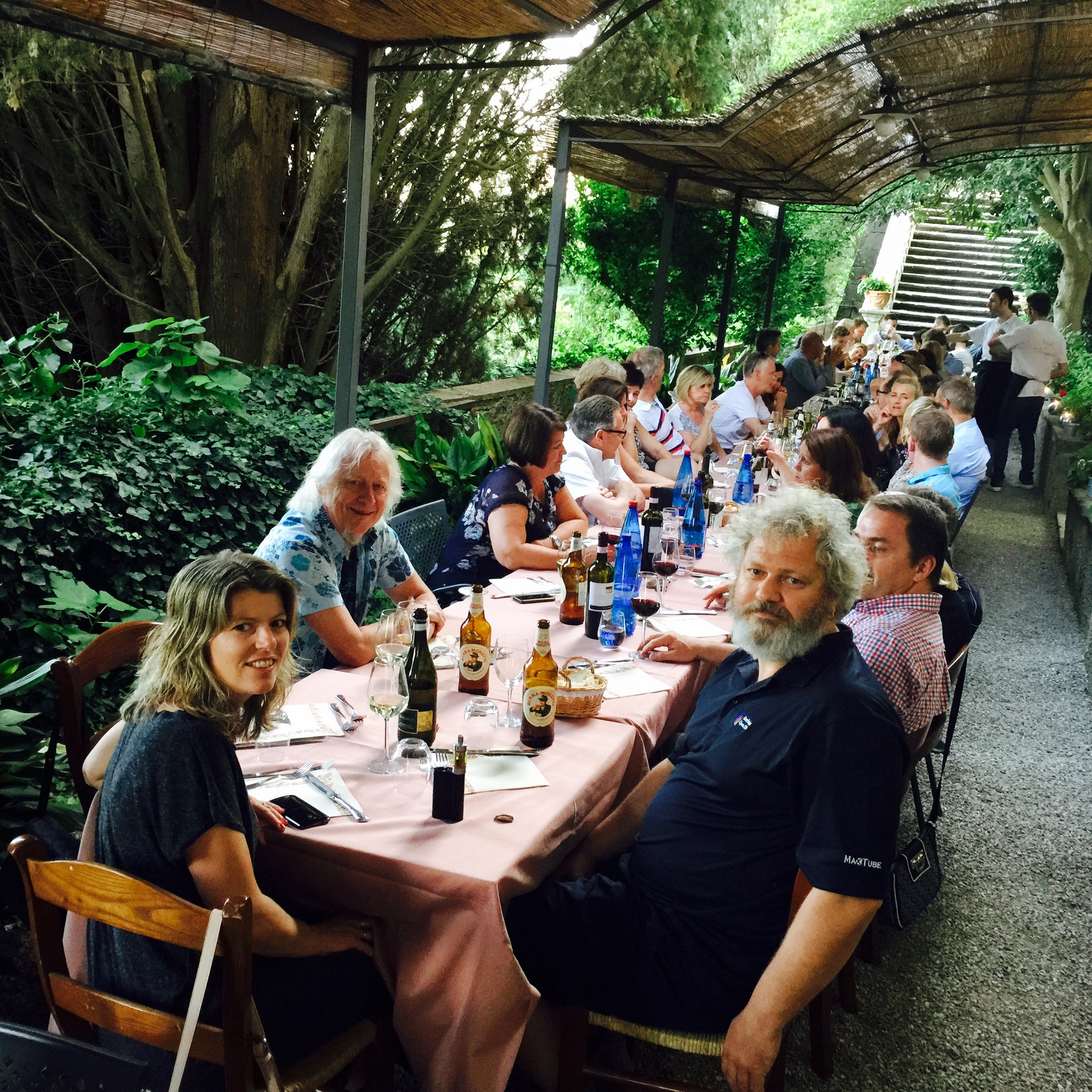 De fleste av gjestene kom i løpet av fredagen. Langbordet i restauranten ble utivdet etterhvert som flere og flere gjester ankom. Det ble langt på natt før vi var fulltallige, hele 52 mann hadde tatt turen til Italia for å være med på feiringen! Kjempestas!