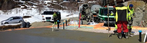 Varmekablene er på plass, nå kan sementbilen komme. Sementbil på plass, nå kan morroa begynne. Ferdig støyt dekke i Fjellbergskardvegen 224.