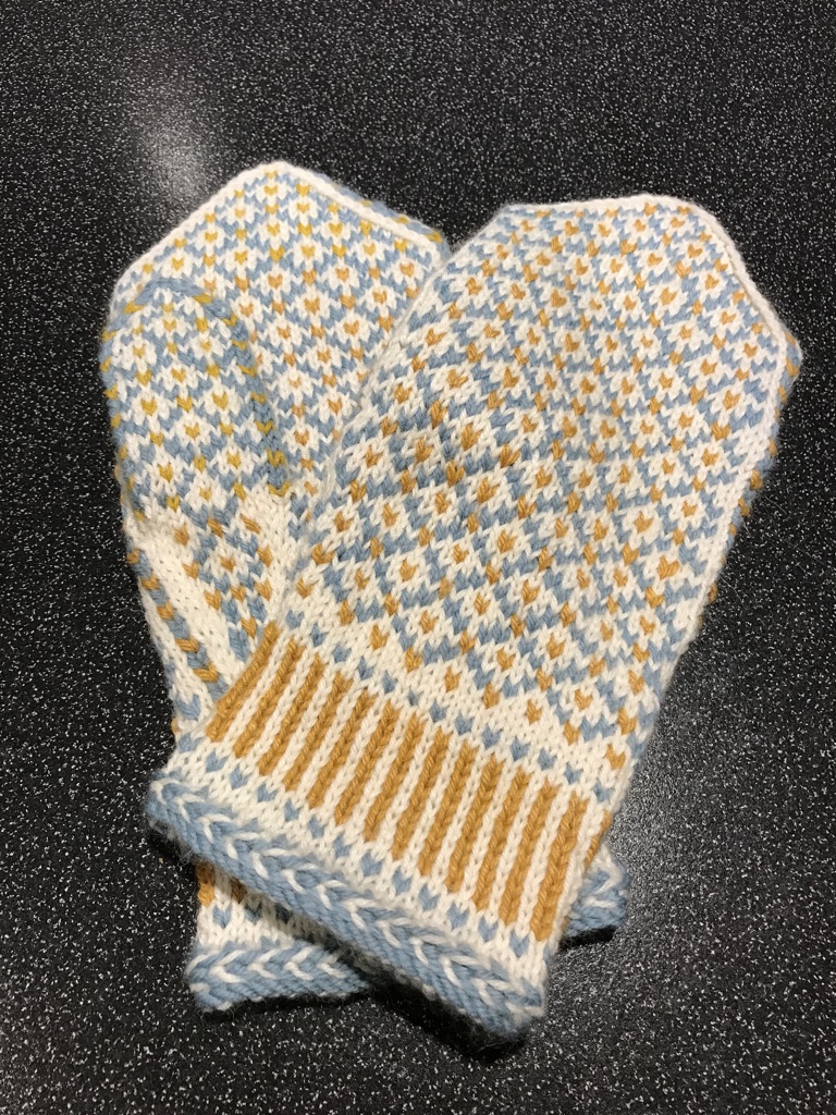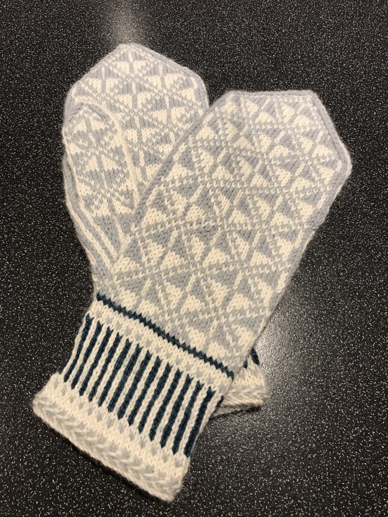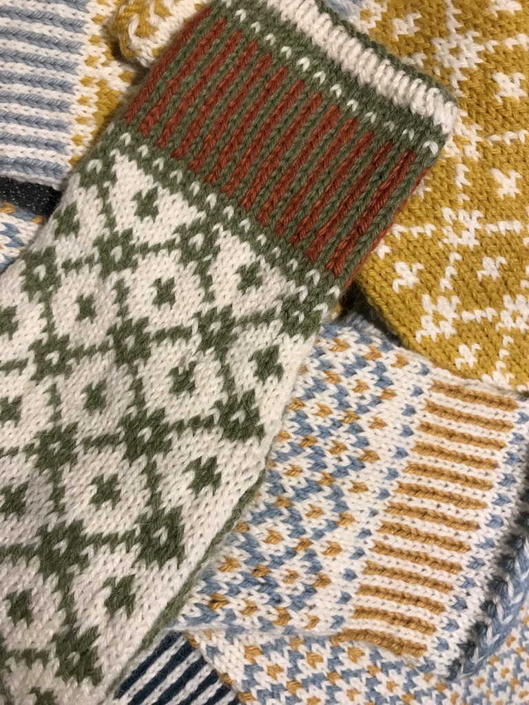 Mønster fritt etter boka Votter og pulsvanter av Clara Falk og Kamilla Svanlund. Har laget noen egne varianter og kost meg med å sette sammen fargekombinasjoner.