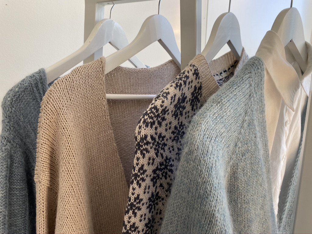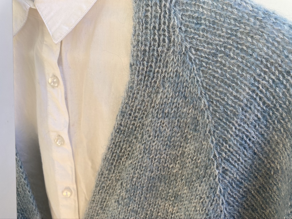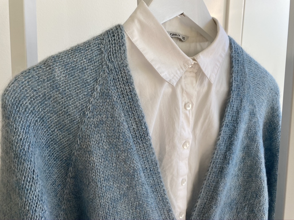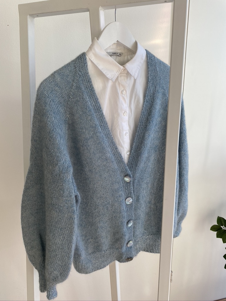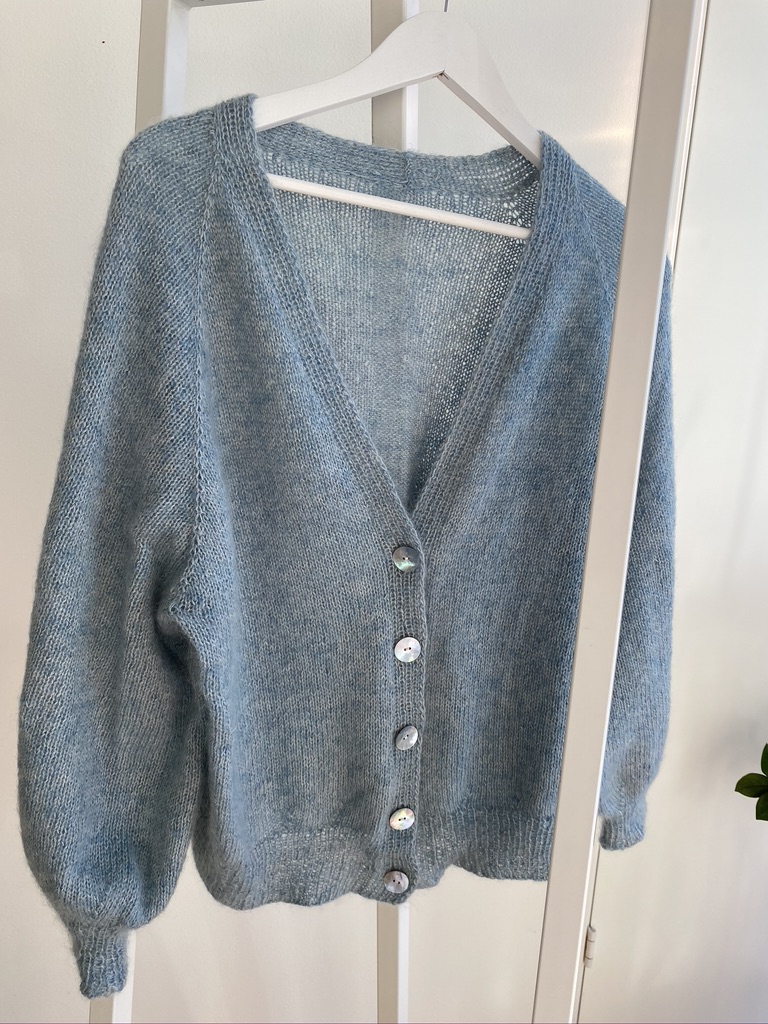 Denne jakken er PetitKnits Ballongcardigan. Jakken strikkes ovenfra og ned. Dette gjør at en kan prøve underveis for å få en jakke som passer akkurat.
