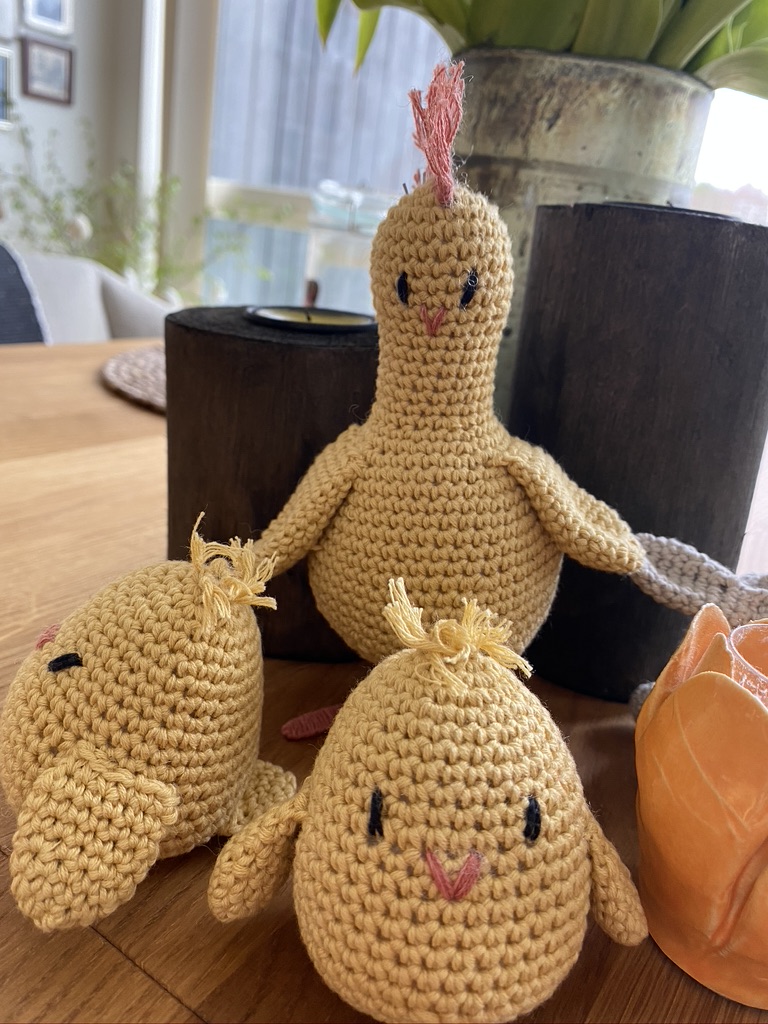 Siden det i år blir hjemmepåske og all påskepynten er på hytta så måtte jeg lage ny påskepynt. Fant disse koselige påskekyllingene på nettsidene til Krea Deluxe. Kyllingene er heklet i Mandarin Petit fra Sandnes Garn.