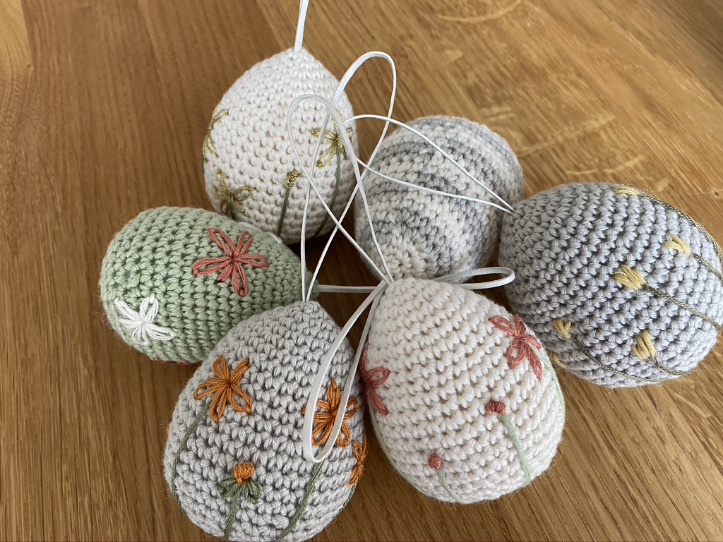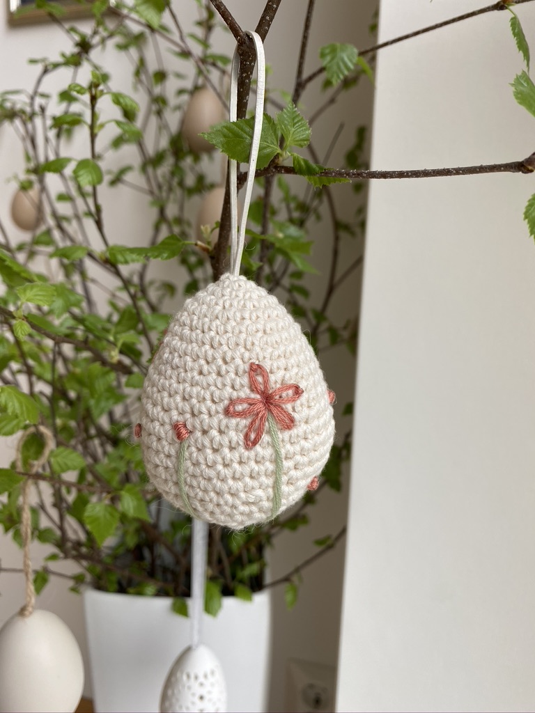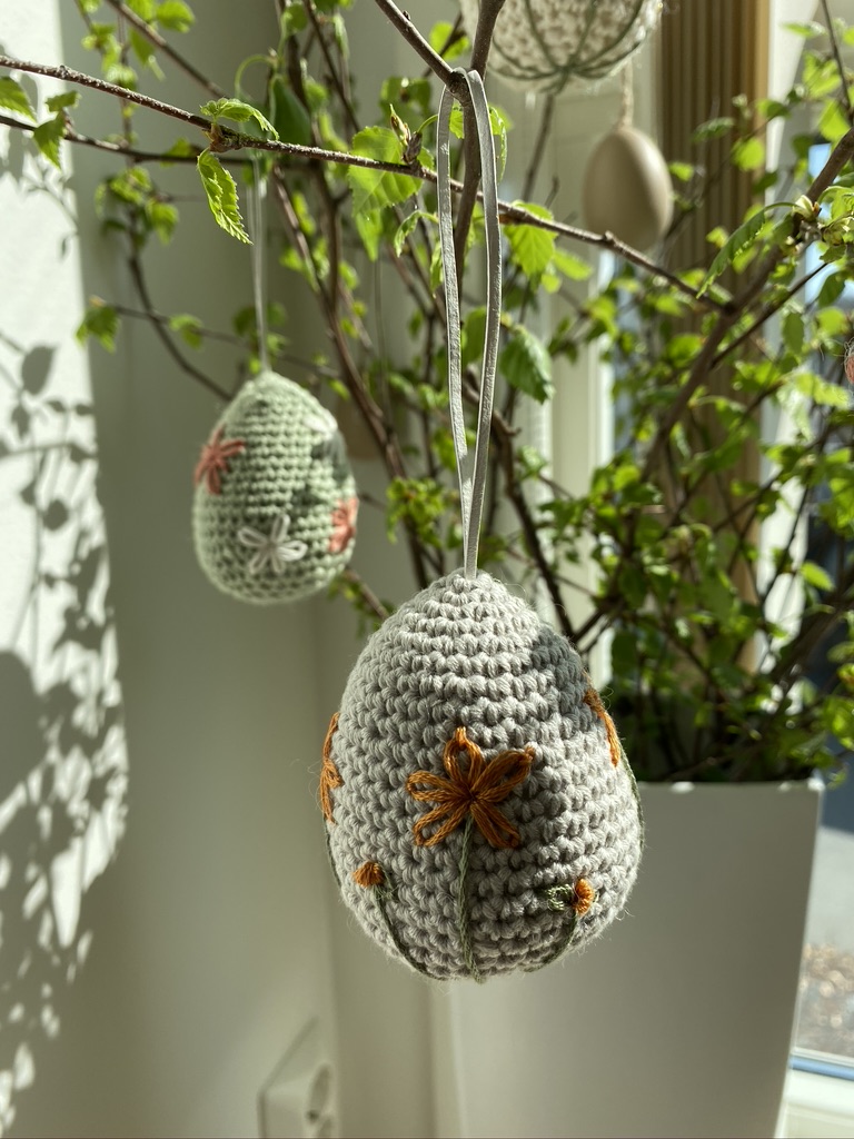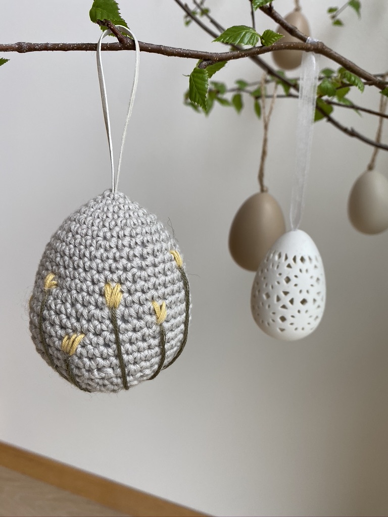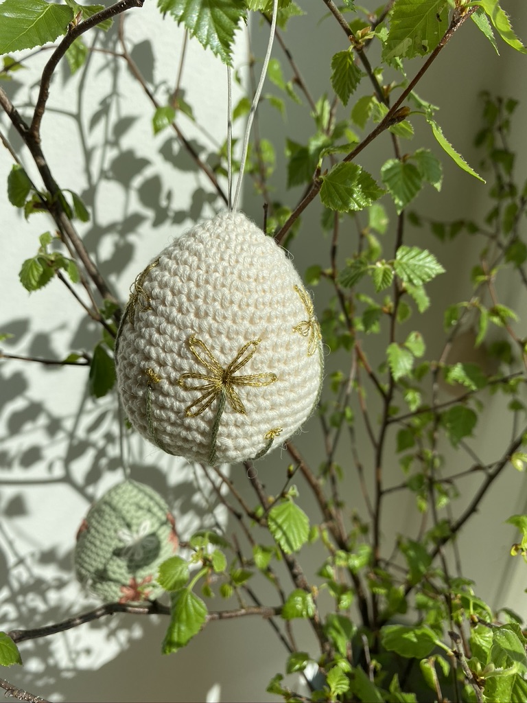 Oppskrift kjøpte jeg på nettsidene til Krea Deluxe. Eggene er heklet i Mandarin Petit fra Sandnes Garn og til dekoren har jeg brukt broderigarn.