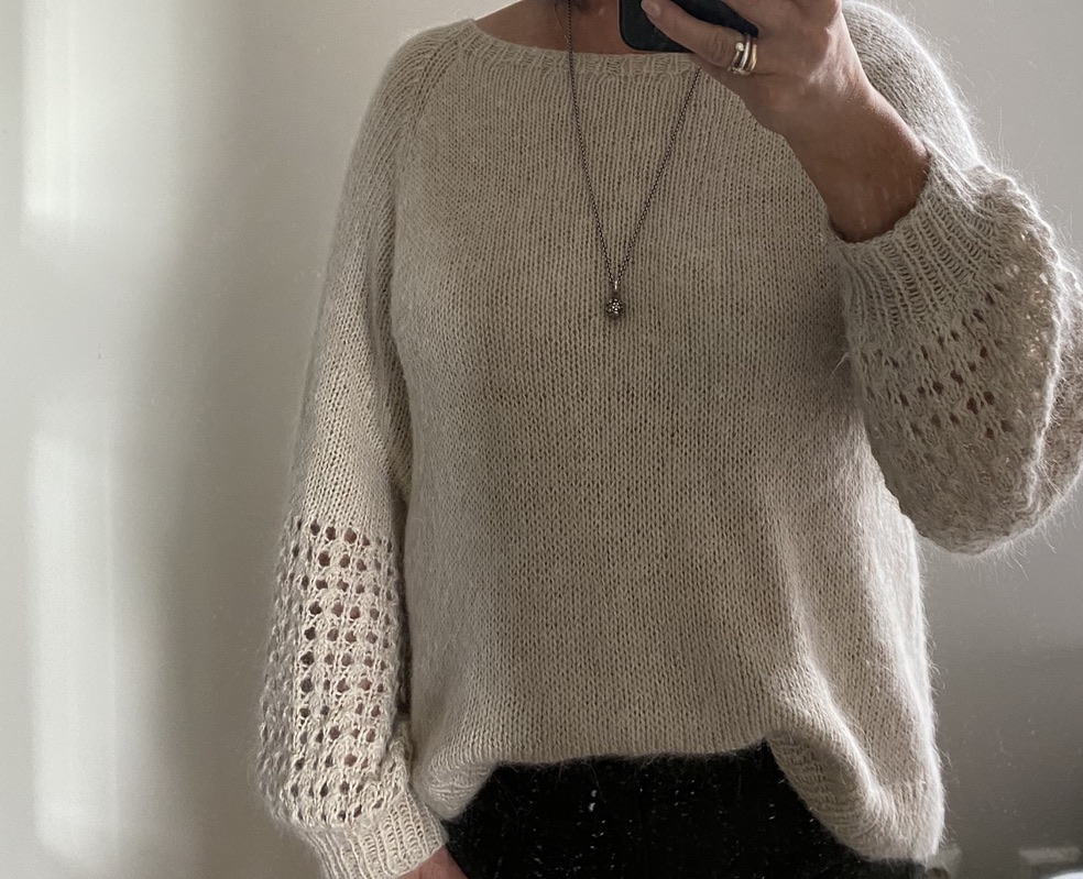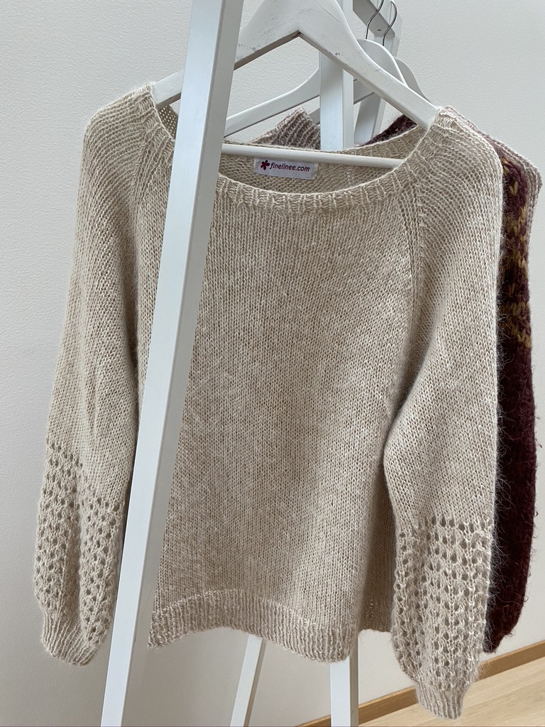 Genseren er strikket i dobbelt garn i kombinasjon av Dale Pure Lino og Dreamline Air.