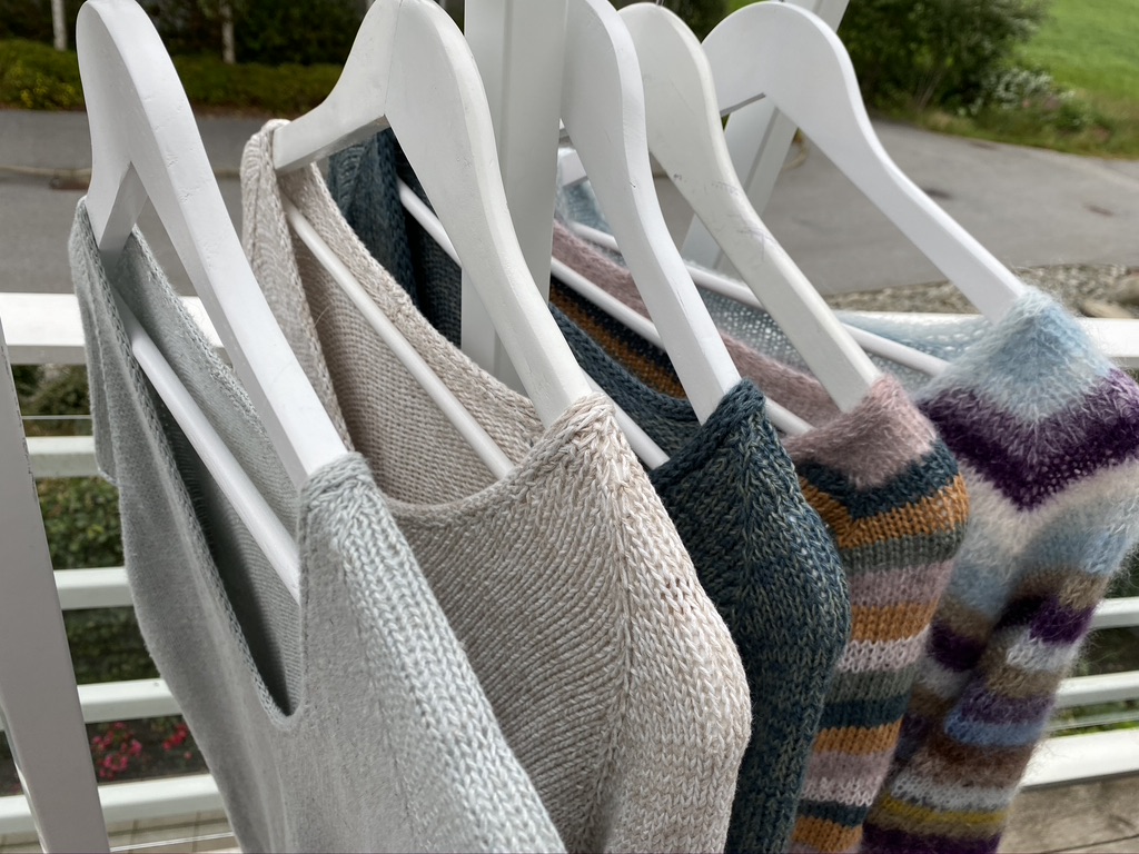De fleste er strikket etter oppskriften til den vanlig Cumulus Blusen mens den kortarmede er den tynnere varianten Cumulus Tee.