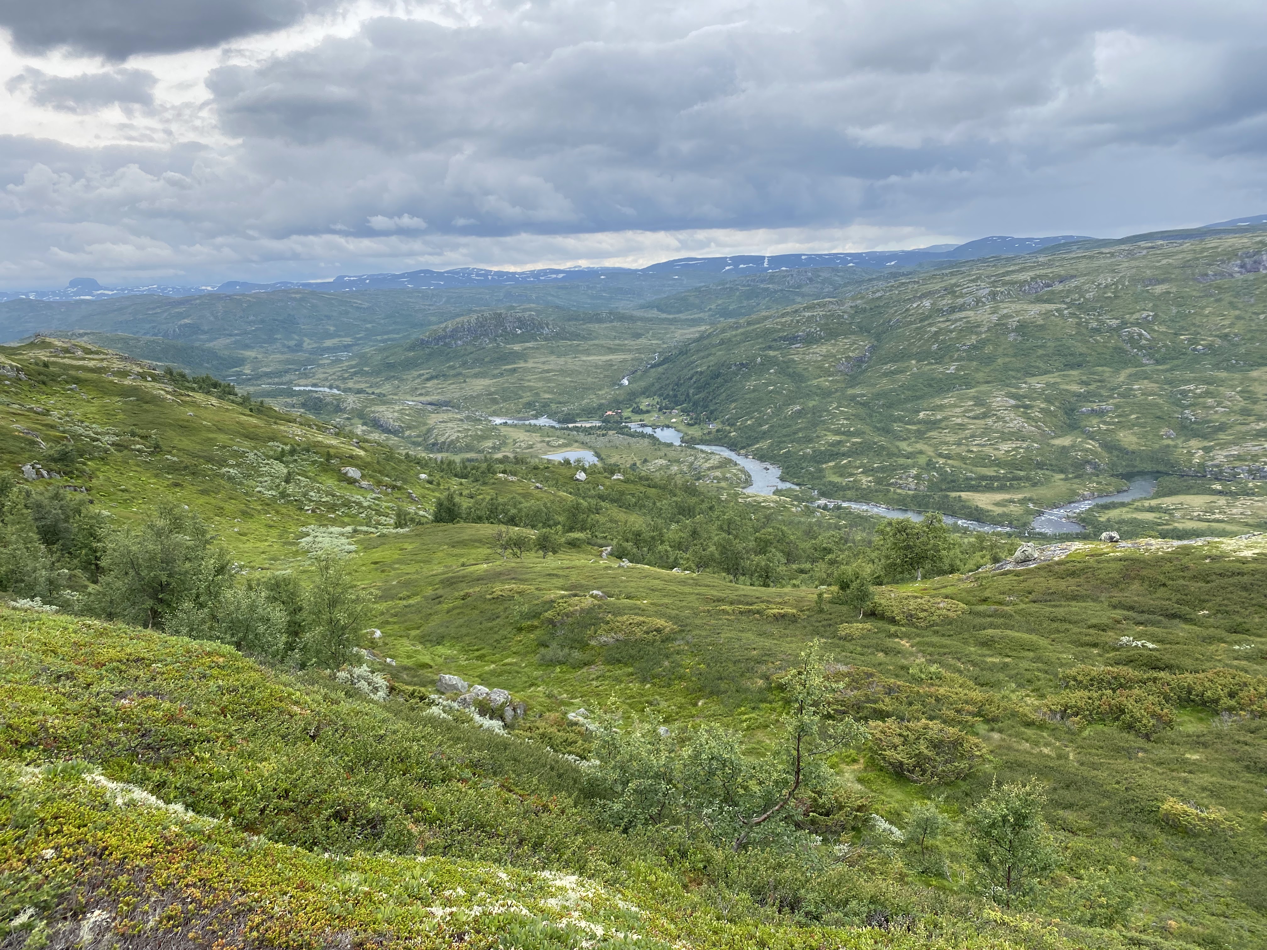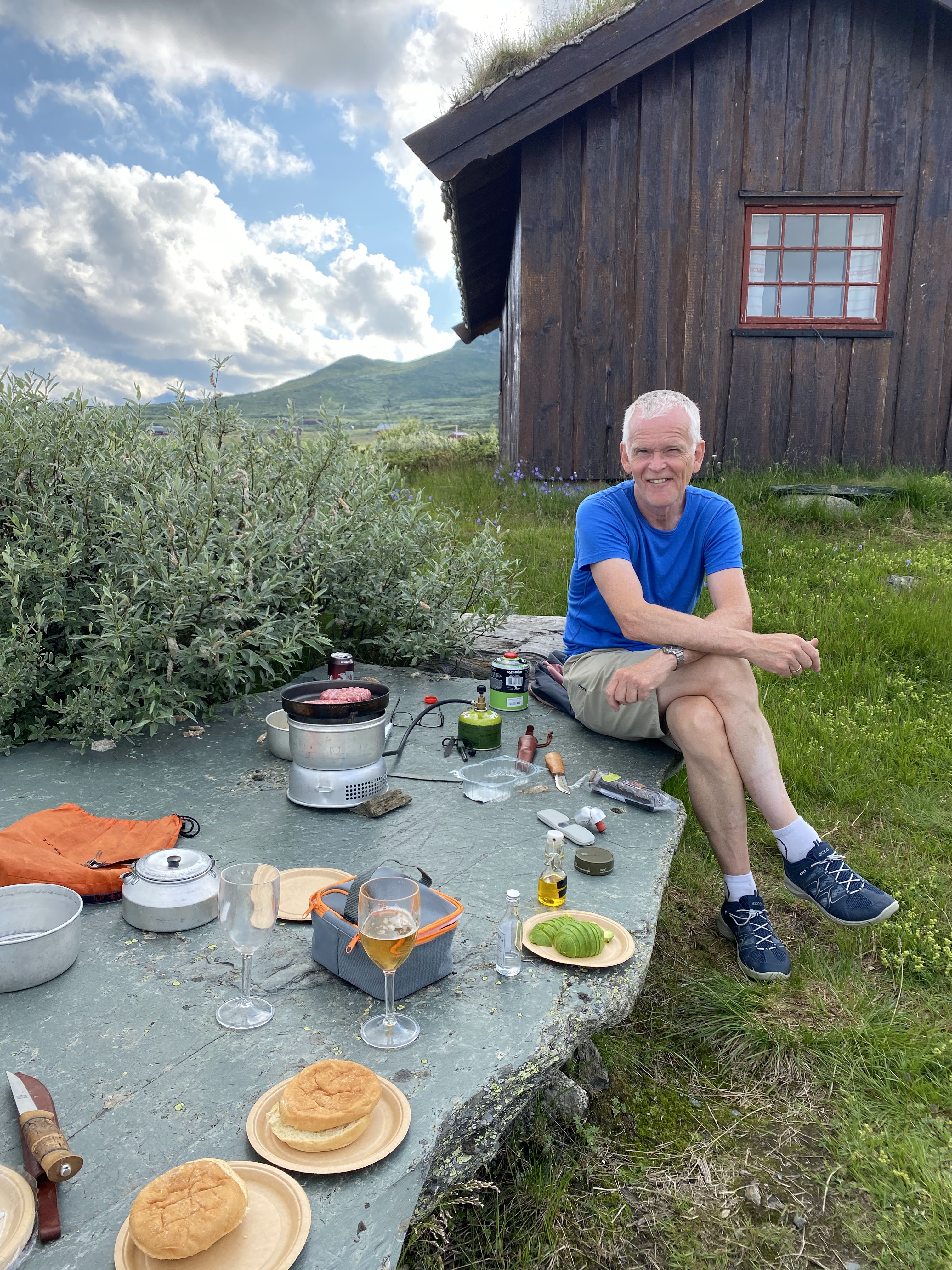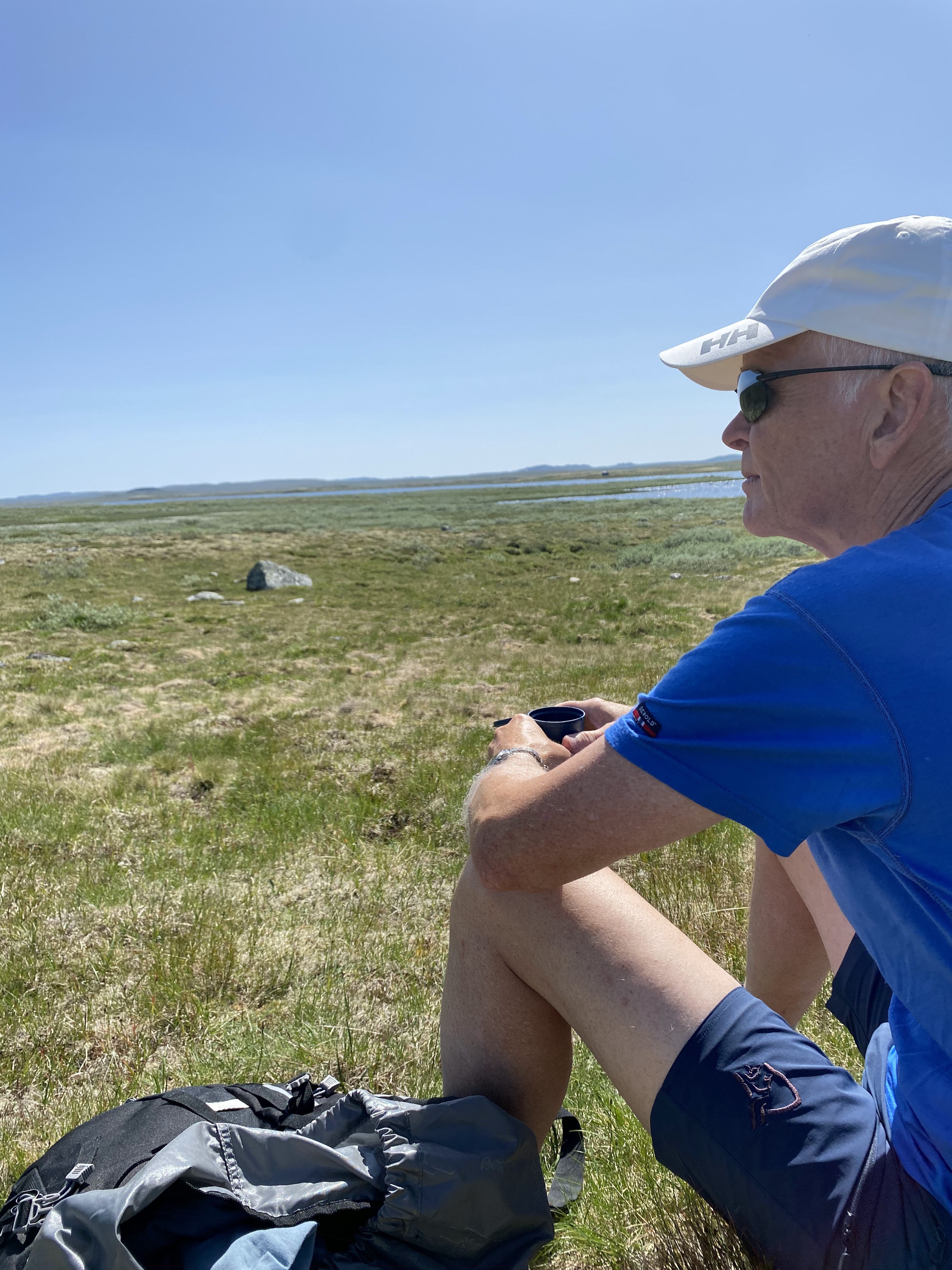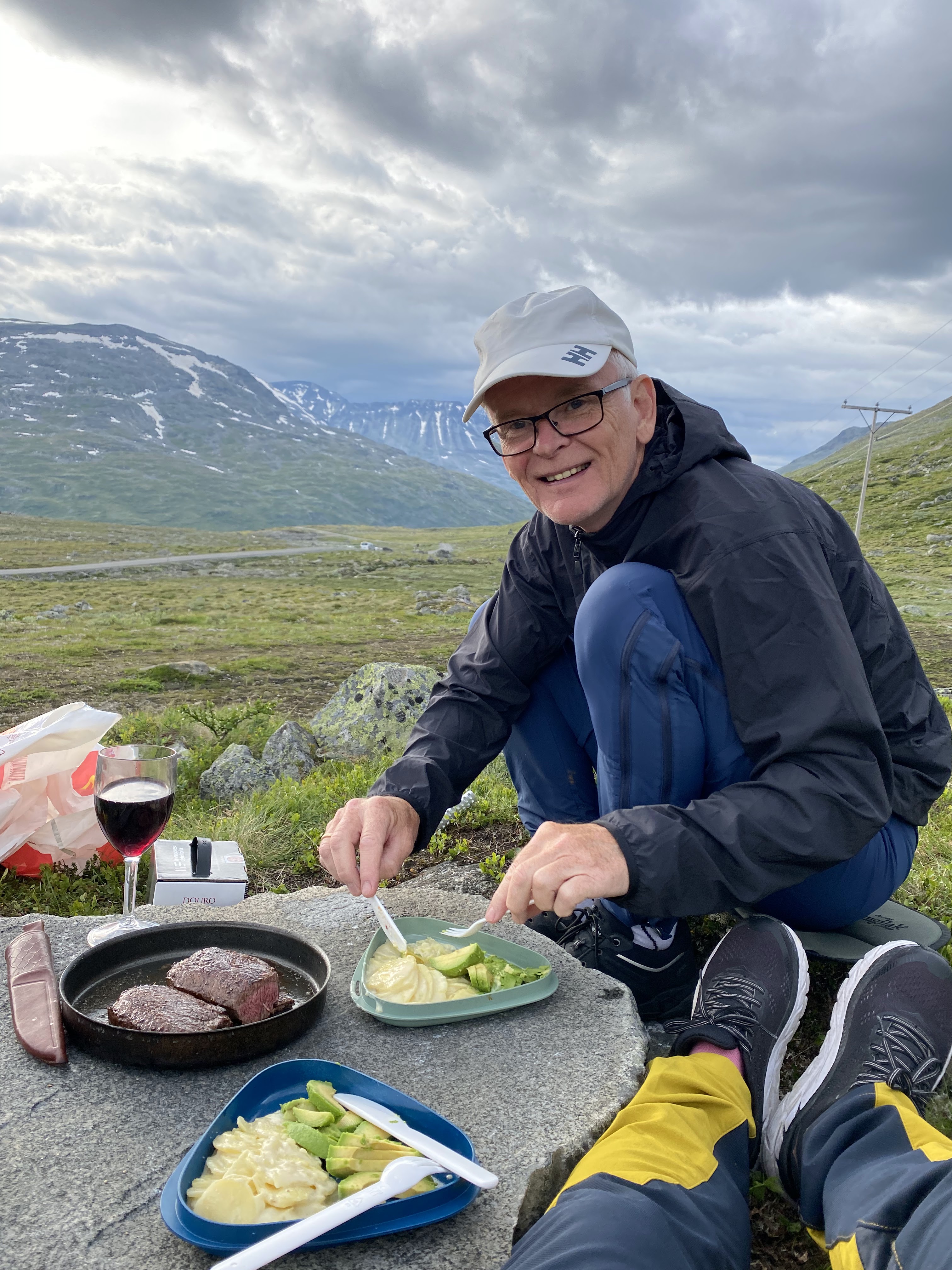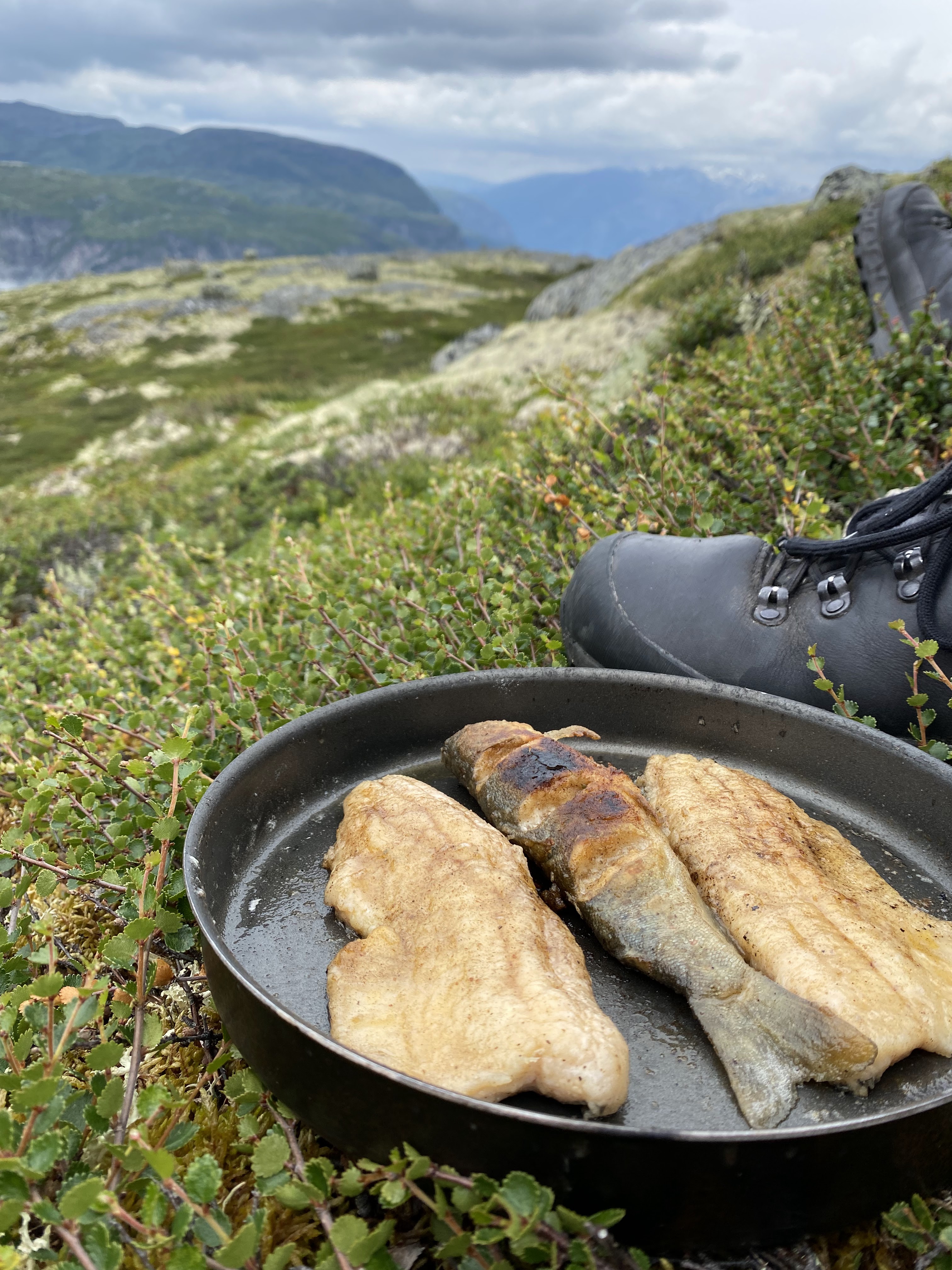 Tilbake til Hjølmoberget tok vi en annen vei. Over Haraldshaugana, ned til Fljoto og så over Storsåta og Vetlasåta. Aurene som ble fisket i går ble en god lunsj.